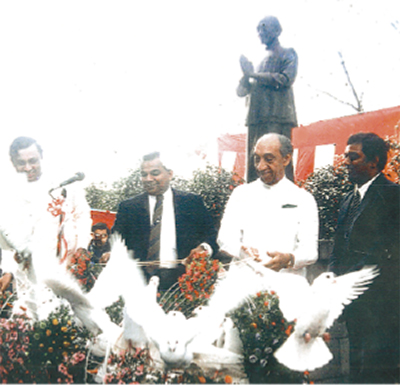 1989年、ジャヤワルダナ氏の同寺訪問が実現した。自らの銅像を前に、「平和の鳩」を放ち一行を迎えた保育園児にこう語った。「世界平和はこうして人と人とが直接会って、お話をすることが大事なのですよ」