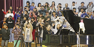 李枝さんは歌唱指導も担当した。教員からは「とても気さくで、子どもたちを『のせ』てくれる」と評判だ。予行演習でも「みんな、すごく上手になったね」と声をかけながら場を盛り上げた。