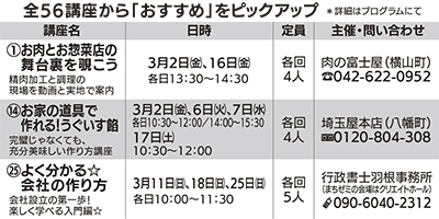 「お肉とお惣菜店の舞台裏を覗こう」「お家の道具で作れる!うぐいす餡」「よく分かる☆会社のつくり方」など今回は合計56講座を用意。それぞれの内容はプログラム、八王子まちゼミの会HP(https://802machizemi.jimdo.com/)で確認できる。プログラムは参加店やスーパーアルプス、市役所などに設置されている。会場は各店舗など。なお、講座の中には申し込み開始日当日に定員となる人気のものもある。