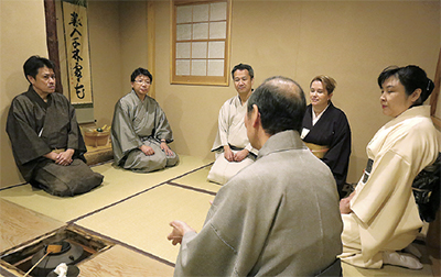 多くの参加者にとってお茶は初めて。講師役の西室博史さん(きものの西室)は「武士の世界で広まったものなので背中から斬られないように、お茶の世界では人の前を横切って良いことになっている」など説明を加えつつ、動作の一つひとつの意味などを説明。参加者の小磯道夫さんは「お茶には日本の文化が詰まっている。作法にも合理性がある。堅苦し無く楽しめた」と話した。