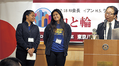 ナナさんは「日本での経験はかけがえないもの。日本の文化、食べ物、習慣、そしてRCも大好き」と日本語で挨拶。エリカさんは「いい体験ができていて感謝しています。学校も楽しい」と笑顔で話した。