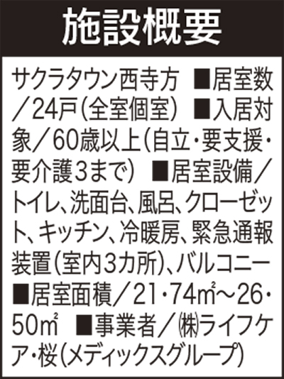 「一人になってしまい不安」「子どもたちに迷惑をかけたくない」。自立しているがそんな思いを抱えている人にはサービス付き高齢者向け住宅「サクラタウン西寺方」(西寺方町)を紹介したい。