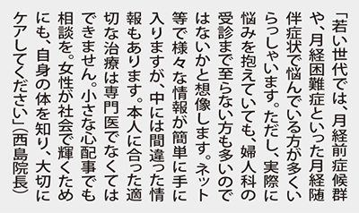 八王子市医師会の理事で西島産婦人科医院(千人町)の西島重信院長は「こうしたイベント通じて、正しい知識を身に付け、婦人科かかりつけ医をもつことの大切さを知ってもらえればと思います」と参加を呼び掛ける。