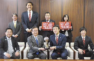 プロバスケ「東京八王子トレインズ」(子安町/和田尚之代表)は3月27日、石森孝志市長を表敬訪問した。