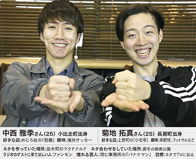 ことあるごとに「八王子出身」と名乗ることにしている。「そうすると反応がいいんです。『遠いね〜』って(笑)」。昨年末から事務所の近く目黒区に引っ越した2人だが、ラジオの収録で八王子には毎週来ている。