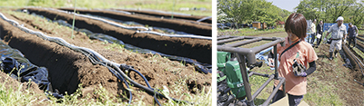 この取組みは産学連携で行われており、この日は小比企町で農業を営む同大学非常勤講師の中西さんの指導の下、約40人の国際学部・農業コースの学生がウネ作りなどを担当。(株)サンホープ(目黒区)がシステムを設置した。工学部がデータを収集しており、学部間連系の場にもなっている。
