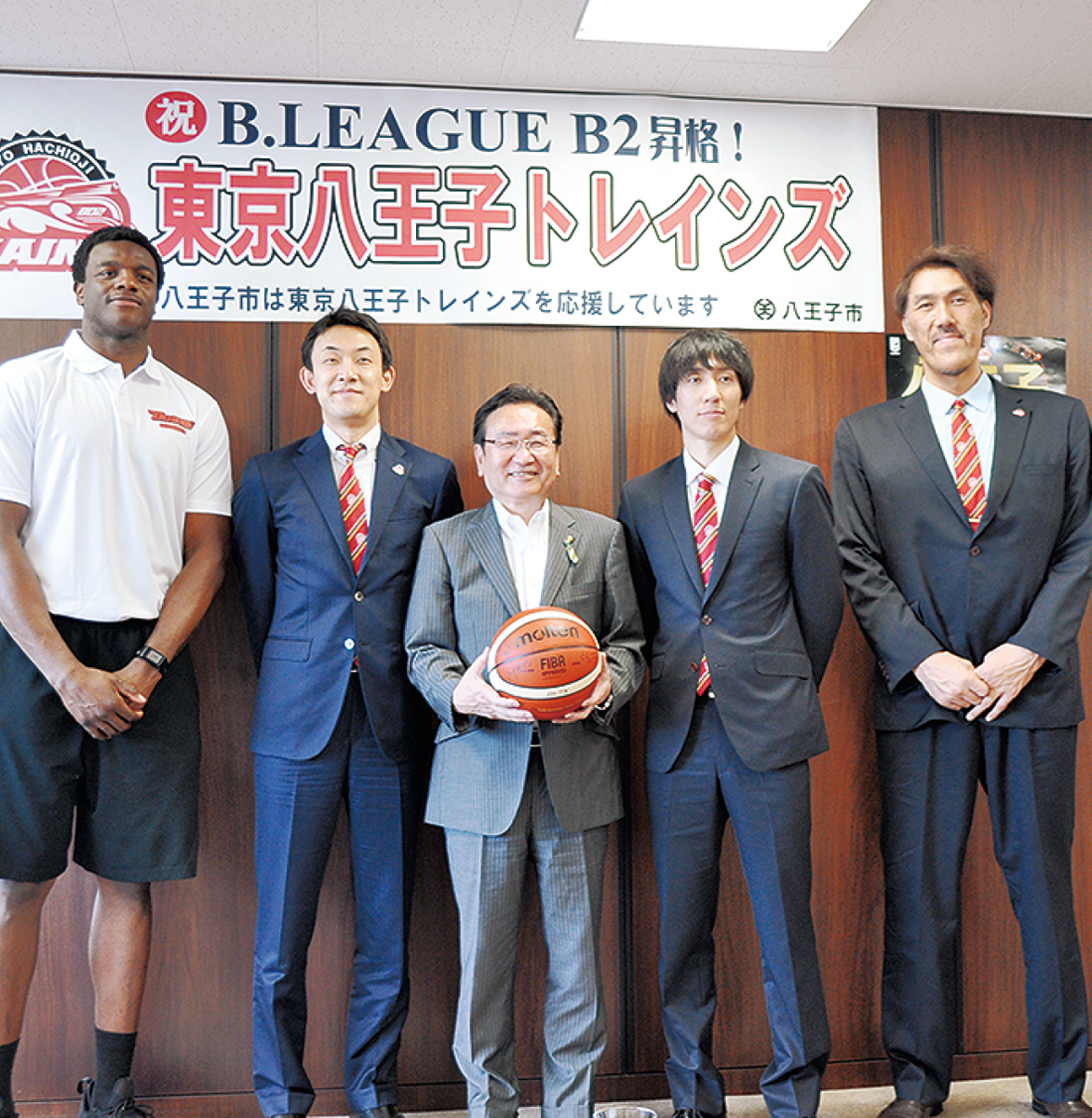 5月27日に行われたBリーグの入替戦で勝利しB2への昇格を果たしたプロバスケ「東京八王子トレインズ」は1日、石森孝志八王子市長を表敬訪問した。