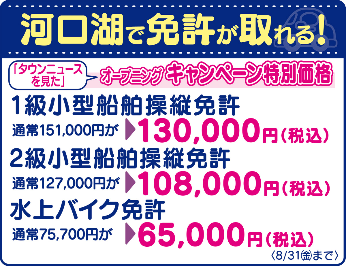 「マリンライセンスロイヤル」では創業130年を記念して、特別価格でのキャンペーンを実施中(対象/河口湖教室)。同校は国土交通省登録の教習所のため学科と実技を終了すれば国家試験が免除となり、短期間で確実な免許取得が可能。アフターフォローも充実しており、釣り大会やレンタルボート体験会、操船セミナーなど免許取得後の”遊び”を学べるメニューが多彩。