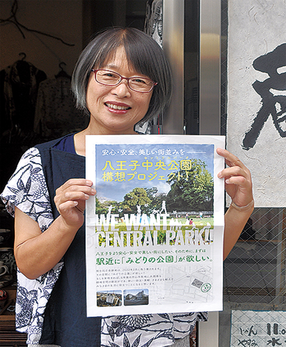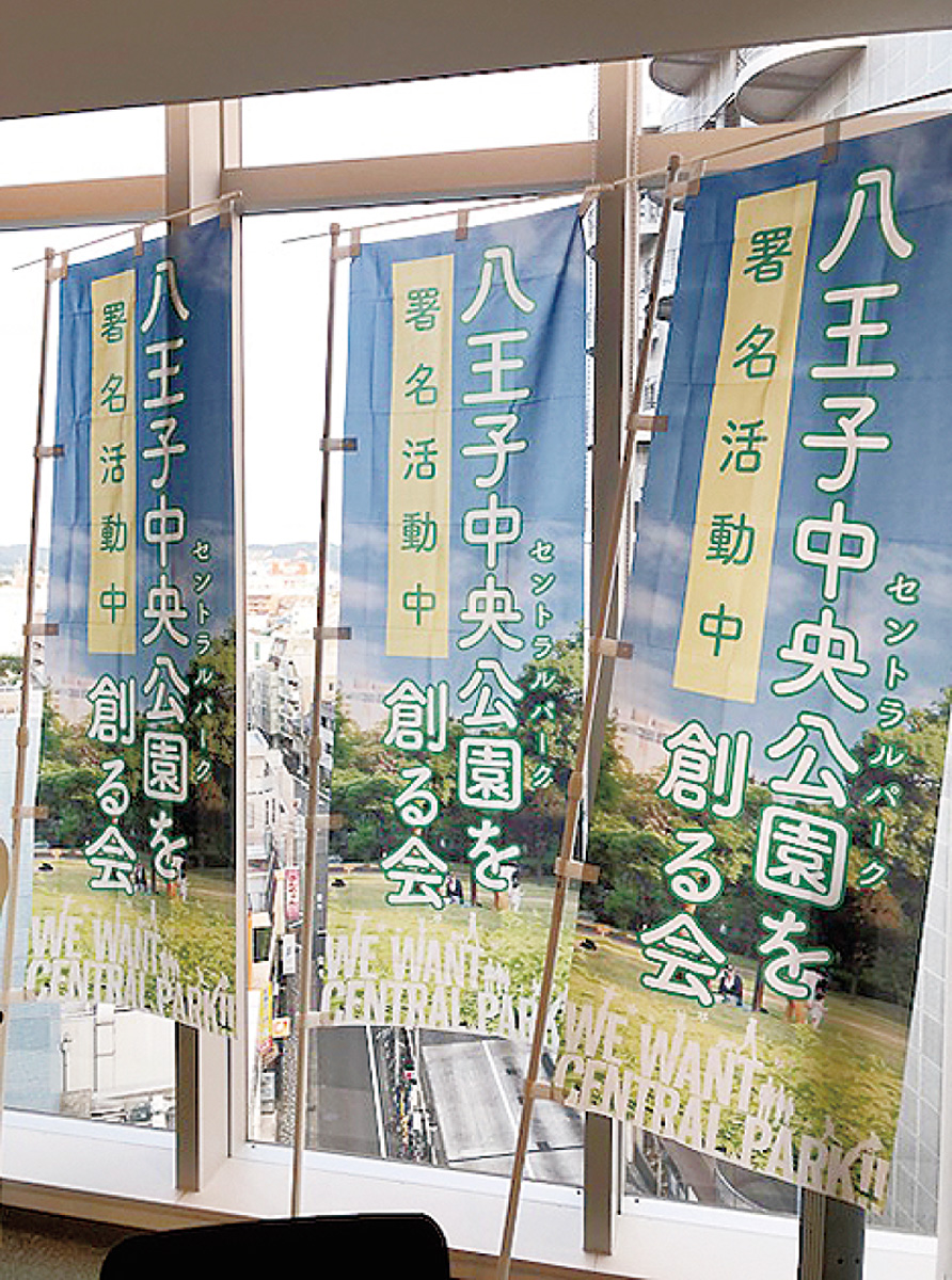 八王子駅近くに「みどりの公園」の創設を訴える「八王子中央公園を創る会」が2カ所で署名活動を行う。