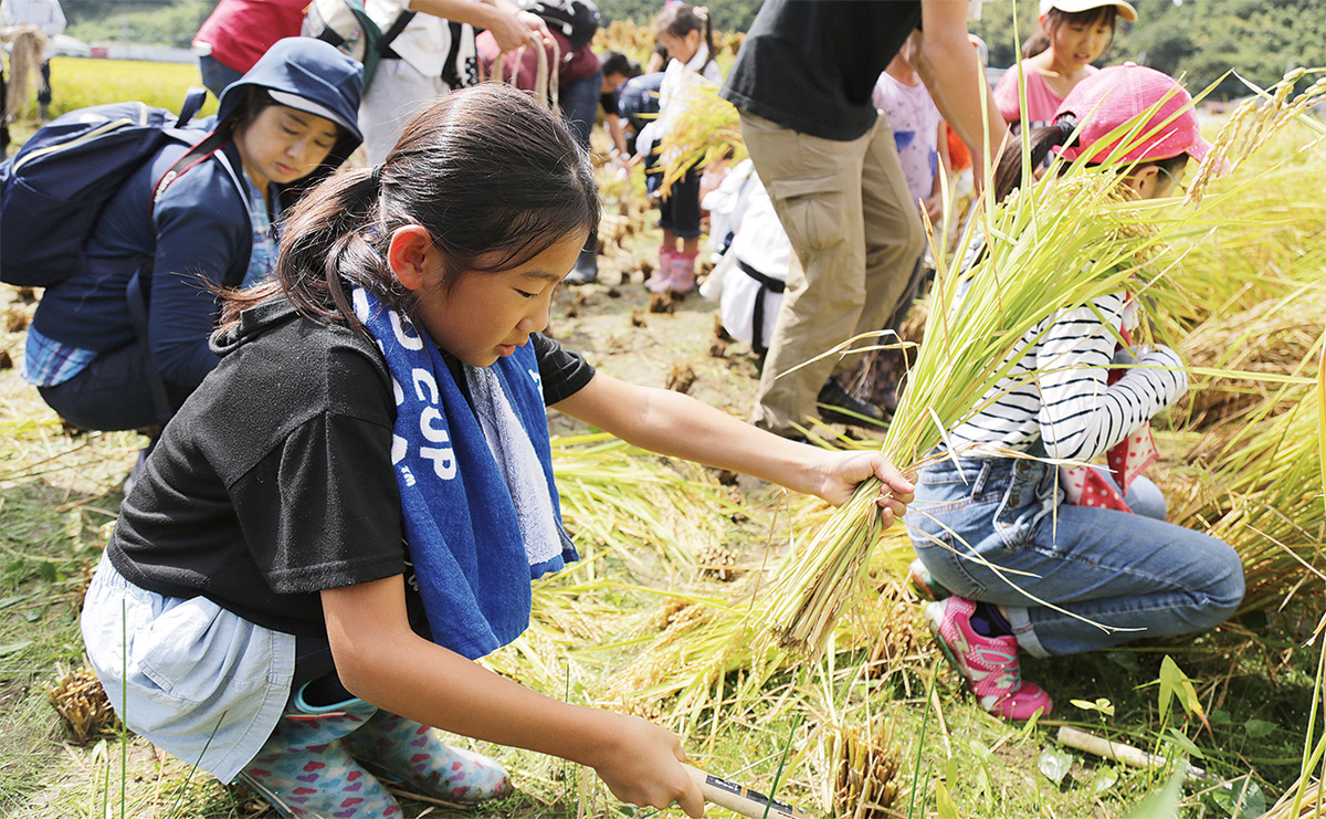 高月町の田に今年も市民らが集まり、9月22日、恒例の稲刈りが行われた=写真。八王子の酒「高尾の天狗」に使用する米づくり企画の一環で、まちおこし団体「はちぷろ」が主催し180人が参加。「ザクザク切る感触が気持ち良い」などの感想があった。泥で遊ぶ子どもの姿も見られた。