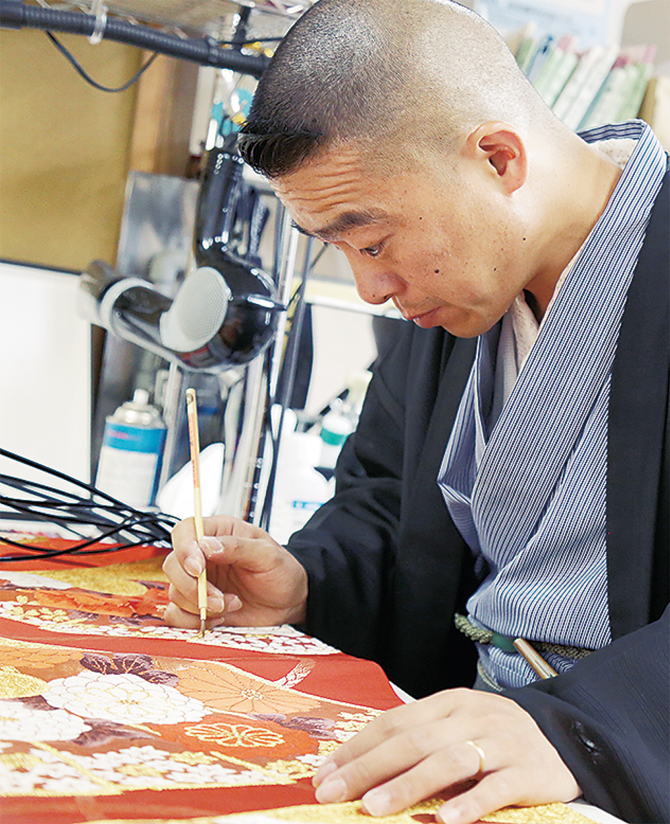 小さな筆を使って、模様と模様の間の黄ばみを消す作業はまさに職人技。周りになじませながら色を足していくと、まるで新品時のような仕上がりに。通常のクリーニングではこうはいかない。汚れ落とし・洗浄・虫干し・プレス仕上げのセットで3500円(留袖・訪問着・振袖・小紋・帯等どれでも1点)。※着物の状態によって見積り