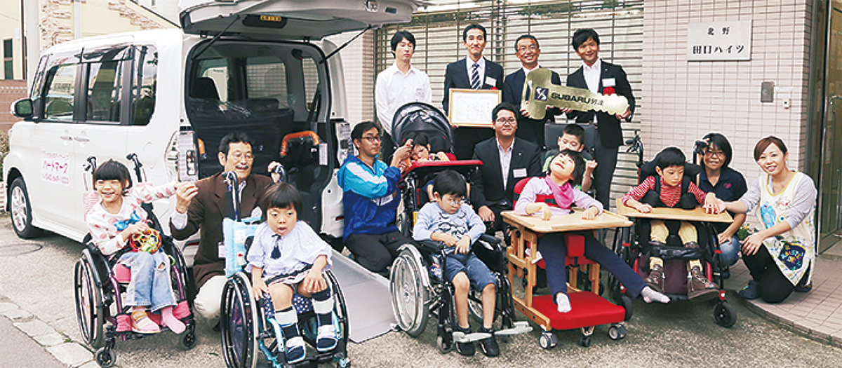 放課後等デイサービス「ハートマーク」(北野町/NPO法人さがみこども福祉会)に12日、SUBARU関連労働組合連合会から福祉車両「スバルシフォン(スロープタイプ)」が寄贈された。同法人理事長の大房朋文さんは「利用者のほぼ全員が車椅子利用者なのでありがたい。末永く大切に使いきたい」と喜んだ。お祝いに駆け付けた市議の伊藤忠之さんは「ありがたい。必要とされる支援」と話した。