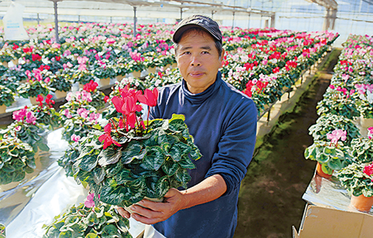シクラメンを南多摩地域で唯一、生産直売している石川農園(高月町)。「赤・白・ピンクなど豊富な色に加え、シボリやフリンジなど花形も豊富。1鉢で3色楽しめるものもあります」。そう話すのは栽培歴40年以上の代表の石川研さん。約3000鉢・30種という膨大な数の中から選べる。同園では、育て方の説明書と簡易温度計が付くほか電話相談にも対応。また万一、購入直後に弱った際は返品も受け付けているのでギフトにも安心だ。