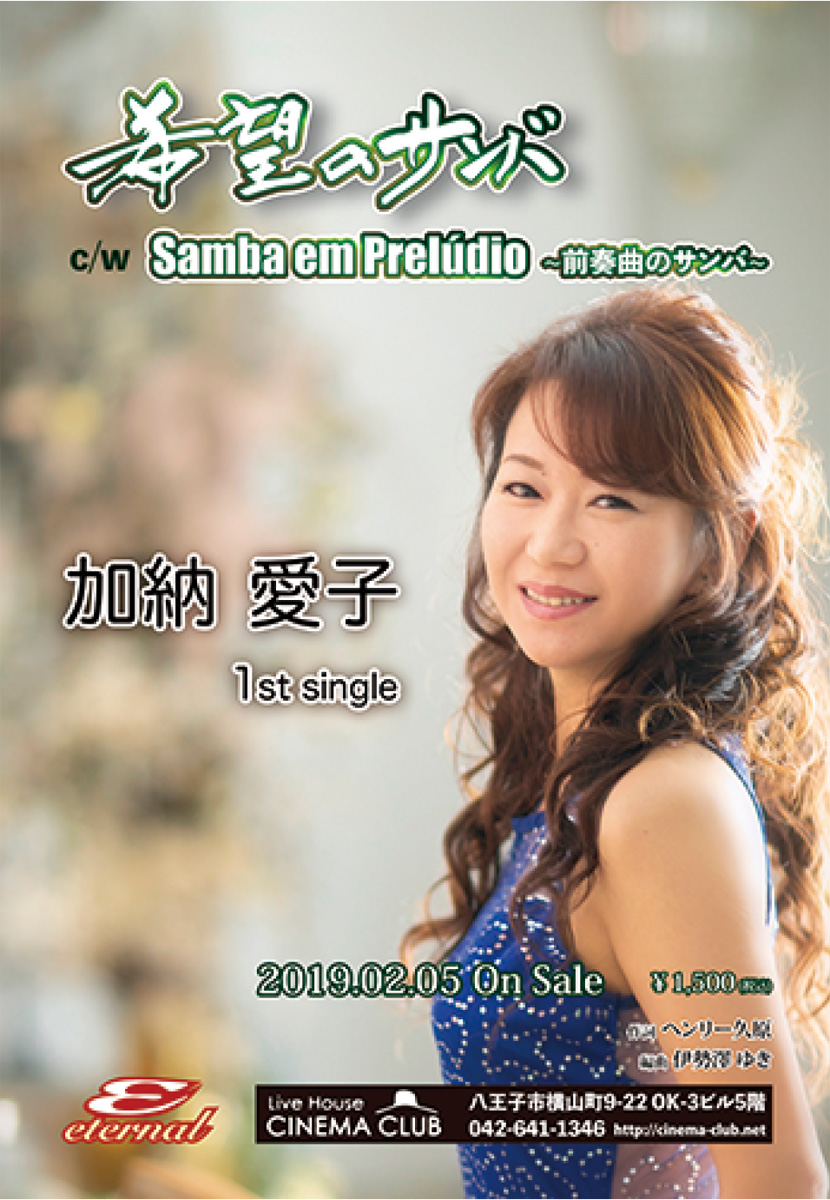 横山町のライブバー「シネマクラブ」のオーナーで歌手の加納愛子さん=人物風土記で紹介=が2月5(火)、CD「希望のサンバ」(エターナルレコード)=画像=でデビューする。