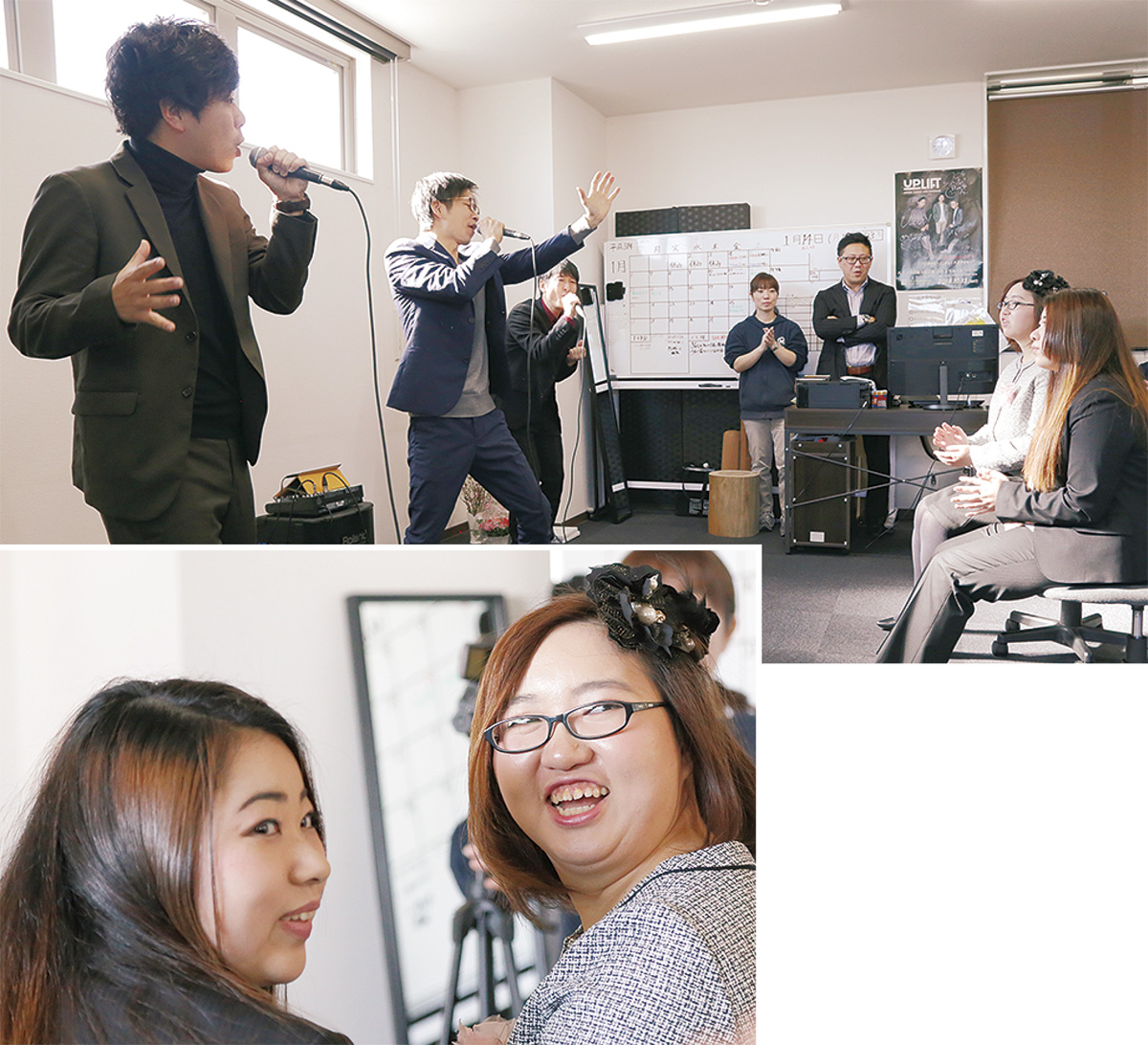 1月14日の成人の日、子安町のめだか販売店((株)あやめ会)で新成人となった同社に勤める原田恵里佳さんと國田萌花さんが祝われ、市内在住の3人組ヴォーカルグループ「アップリフト」によるサプライズライブがあった。