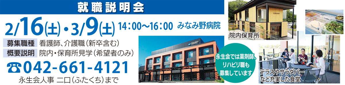昨年4月に開院した医療法人社団永生会「みなみ野病院」で2月16日(土)と3月9日(土)に就職説明会が行われる。昨年の暮れから継続的に説明会を開催してきたが、予想を上回る応募があるという。