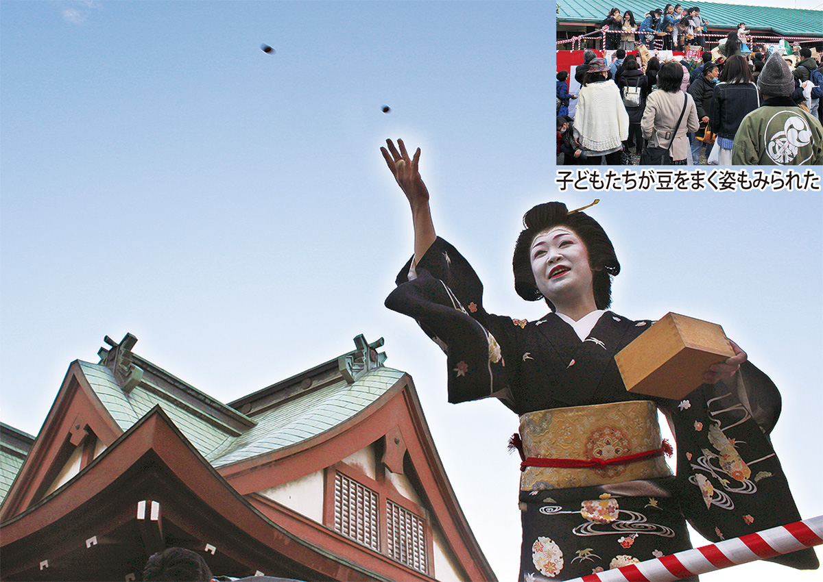 太鼓や笛の音が鳴り響くなか、今年の福を祈って、八王子市内の経営者や演歌歌手、芸者衆などが特設ステージ上から豆やお菓子をまくと、集まった人たちからは「こっちに投げて」「お姉さん、私に頂戴」などの声があがっていた。