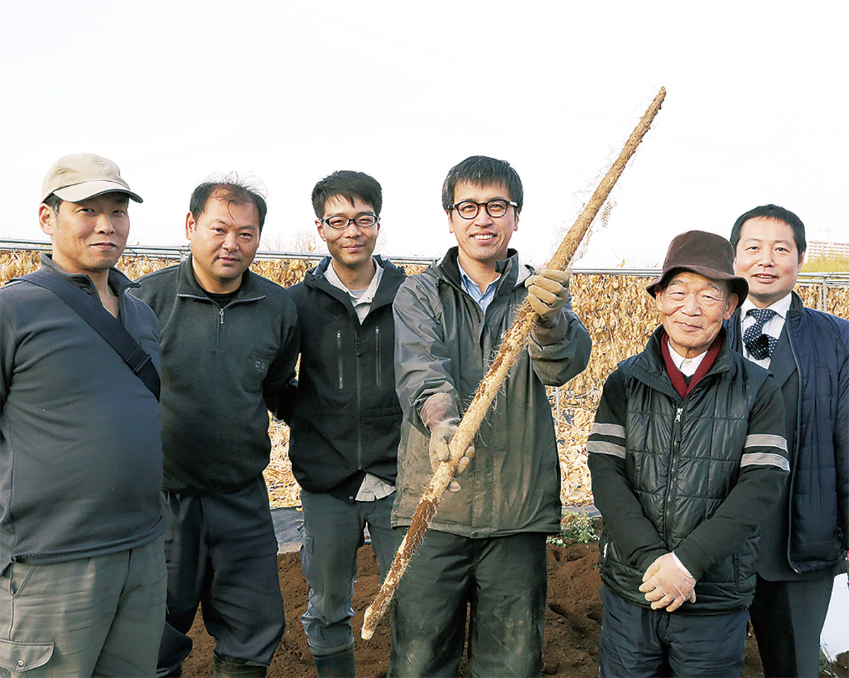 この日は石川さんも所属するJA八王子青壮年部から塚本浩史部長と関純一さん、林剣也さんが参加。また、自然薯研究家の安留幹雄さんと、外食事業を展開する千人町の(株)アーバンの渡辺徹部長も同席した。試しに数本を掘り起こしたところ、昨年の2〜3倍の大きさに成長していた。手にした渡辺部長は「大きさや形はもちろんだが、それ以上に状態が良くないとこういう『肌質』にはならない」と太鼓判を押す。