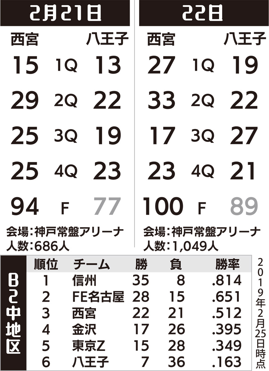 プロバスケB2東京八王子ビートレインズ(中地区)は2月21、22日、兵庫県で西宮ストークス(同)と戦った。21日は77-94、22日は89-100で敗れた。