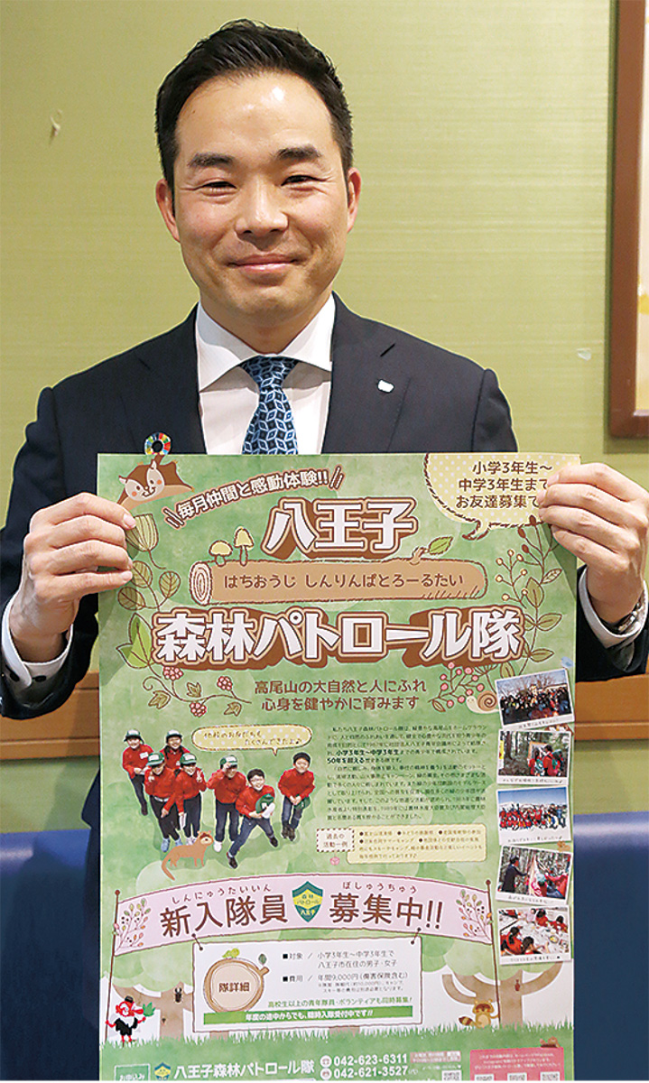 体験活動を通じて自然の大切さに触れ合う「緑の少年団」の中でも、先駆け的存在として1967年に八王子青年会議所(JC)によって結隊された「八王子森林パトロール隊」。今年から新隊長として指揮を執る長田信介さん(多摩養育園)は「肯定される場所を作りたい」と話す。