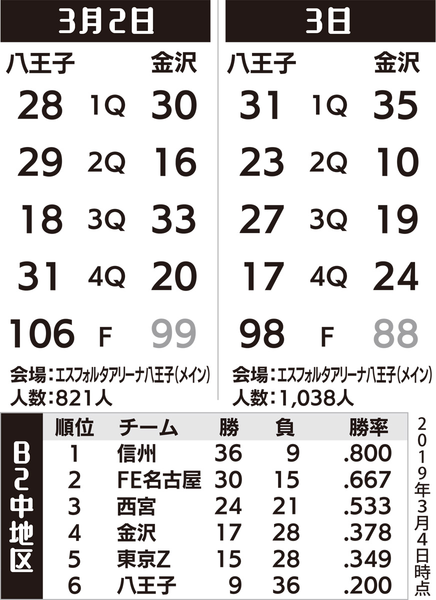プロバスケB2東京八王子ビートレインズ(中地区)は3月2、3日、狭間町のエスフォルタアリーナ八王子で金沢武士団(中地区)と戦い連勝した。2日は106-99、3日は98-88。ホームでの連勝は今季初。