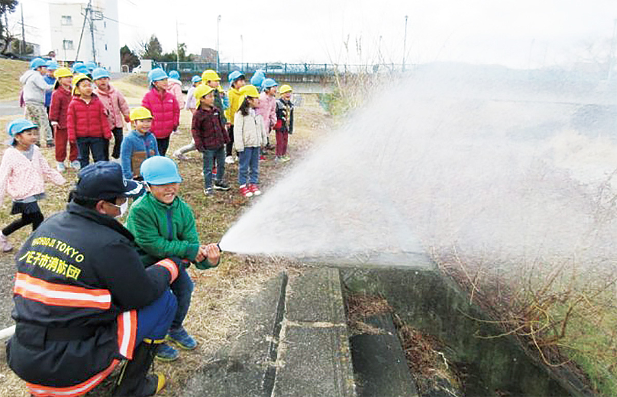 並木町のいなりもり保育園に先月、園近くの消防団が来園し、放水訓練などを披露。子どもたちを喜ばせた。