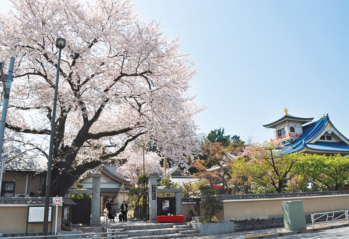 台町にある寺院「信松院(しんしょういん)」は、そのスポットのひとつと知られる。青が美しい観音堂と桜のピンクの調和が例年、参拝者を楽しませる。写真は昨年3月31日撮影。
