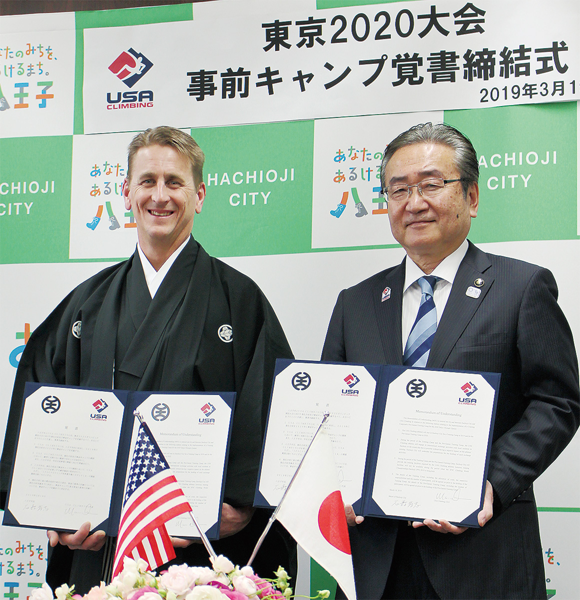 同日には、八王子市役所内で両者による覚書締結式が行われ、その席で同米代表のマーク・ノーマン氏は「素晴らしいパートナーシップを結ぶことができた」と笑顔をみせ、ボルダリングの国際大会開催の実績がある八王子でキャンプを張れることに喜びをみせた。