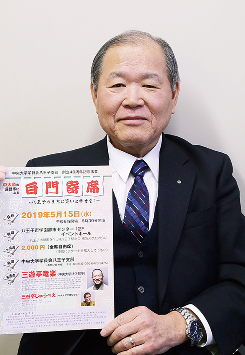 中央大学の同窓会「中央大学学員会」の八王子支部が創立40周年を迎えた。それを記念し5月15日、卒業生で落語家の三遊亭竜楽さんを招いて「白門(はくもん)寄席」を開催する。その歴史を馬場榮次支部長に振り返ってもらった。