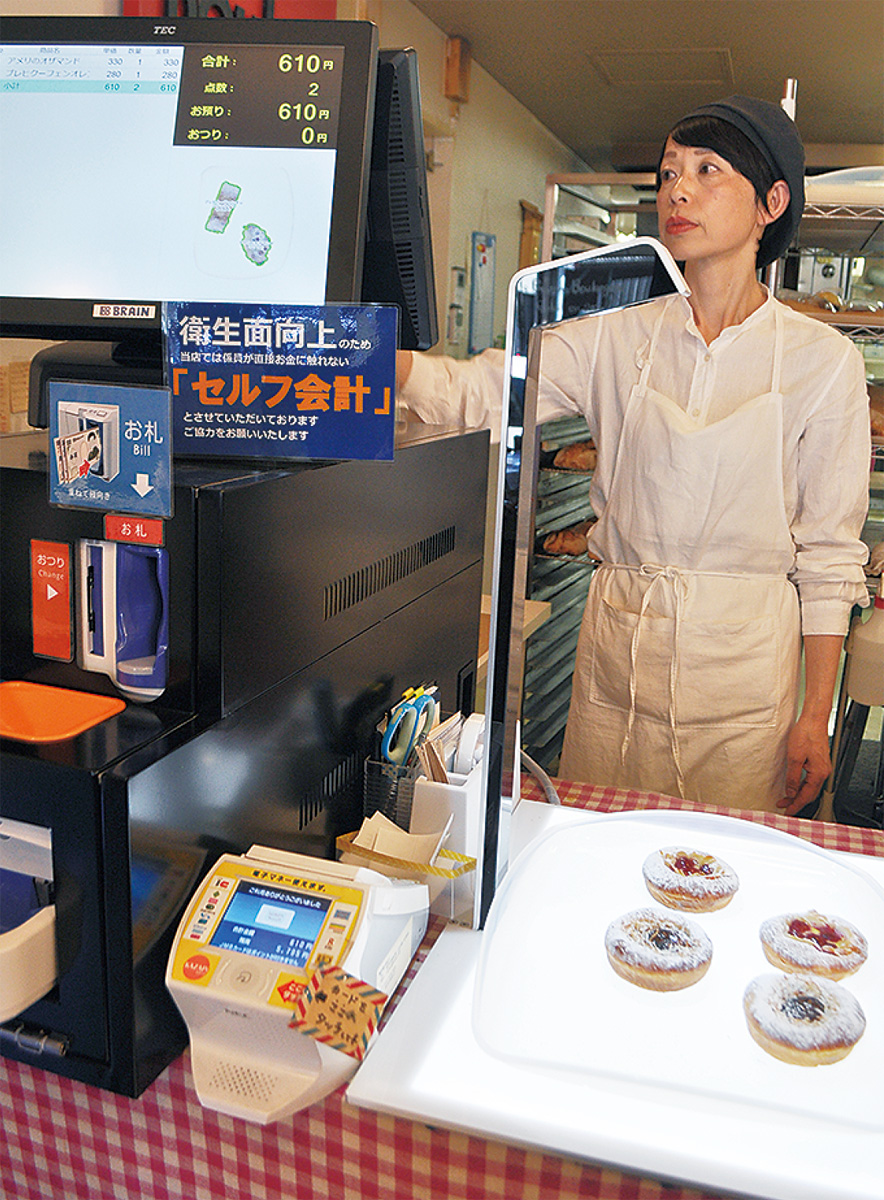 レジカウンターにあるトレイにパンを置くと機械が種類、個数を認識し、金額が表示される。利用者はその金額をレジへ投入する。袋に詰める作業はスタッフが行う。「パンを触った手でレジを打たなくて済むようになりました。衛生面を考慮し導入を決めました」と店主の草野武さんは話す。