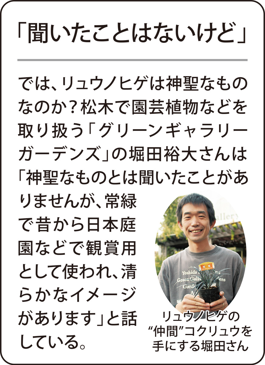 「神聖な場所だったからと、幼い頃聞いたことがあります」――。祖父が住む「実家」が現在の武蔵陵墓地内にあったという、塚本吉紀さんはこう話す。母親の祐子さんが地域の歴史などを調べたものを、塚本さんがまとめ直した本には、神竜が住む「竜カ谷戸」と言われる神聖な場所が現在墓地がある場所にあったことから、この地が「大正天皇のお墓」に選ばれた、といった内容が記されているのだという。「その場所にはリュウノヒゲという草が多く群生していたようです。縁起が良いものとされていたようで、その草の実は青く、ブルーの光を出していたとされます」と塚本さんは微笑みながら説明する。