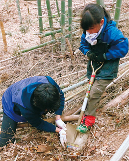 学生たちは、以前に市民団体のメンバーらから教わったタケノコ掘りの方法を子どもたちに指導するなど、「地域のお兄さん、お姉さん」の役割を果たし、参加した同大学2年の宮崎仁美さんは「子どもたちと遊ぶことができて楽しかった。地域の方々と交流することでそれぞれの立場からの視点があることを知ることができた」と専攻するデザインにその視点を生かしていきたいと笑顔。