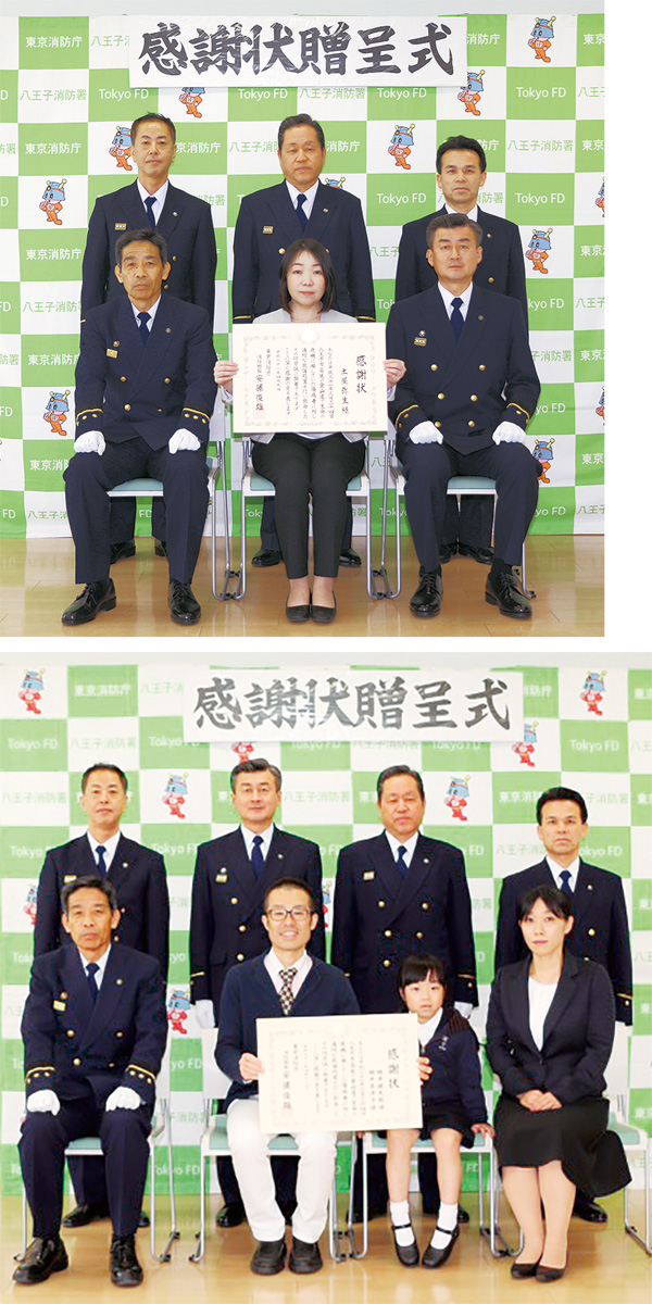 高尾山で人命救助を行ったとして、4月9日と12日に八王子消防署(上野町)で消防総監感謝状の贈呈式が行われた。同賞は東京消防庁が発行する感謝状の中で最高位のもの。