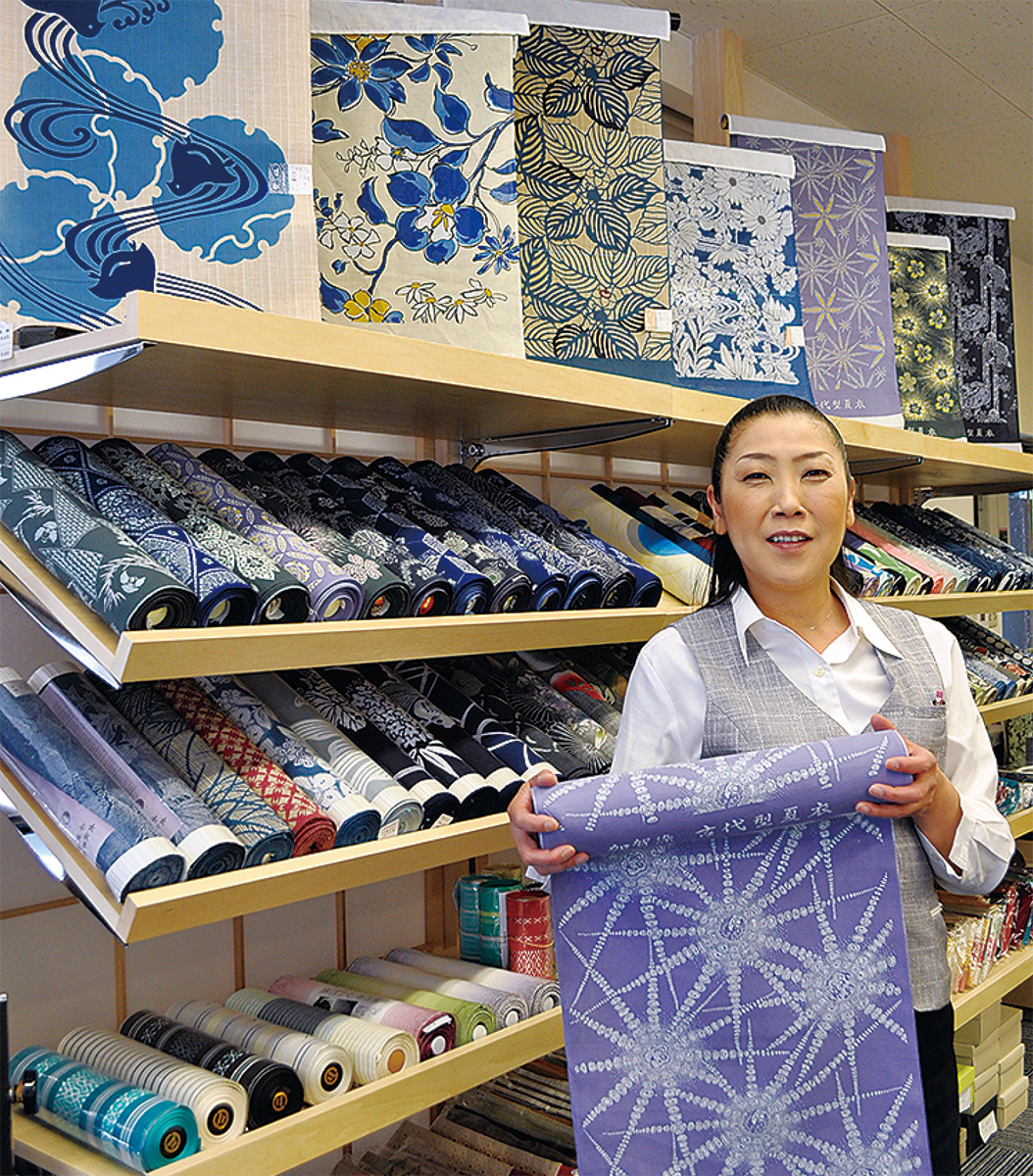 同店では現在、浴衣用の反物をおよそ400点展示。注染をはじめ長板中板や絞りといった伝統染色技法で仕上げた逸品もある。どれも一点ものだ。「だからまつり会場等で、同じ柄を着た人に会う心配はありません」。また、自分の体に合わせて作るので、「着付けがしやすく、着くずれしにくい。そして何と言っても着姿がきれい」と荒井社長はそのメリットを説明する。