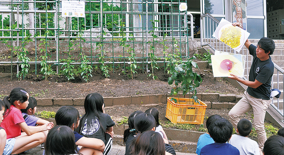 恩方第一小学校(下恩方町)で6月27日、地元農家、番場正敏さんによる理科の特別授業があった。その前の週に校内に植えられたパッションフルーツについての説明が行われた。