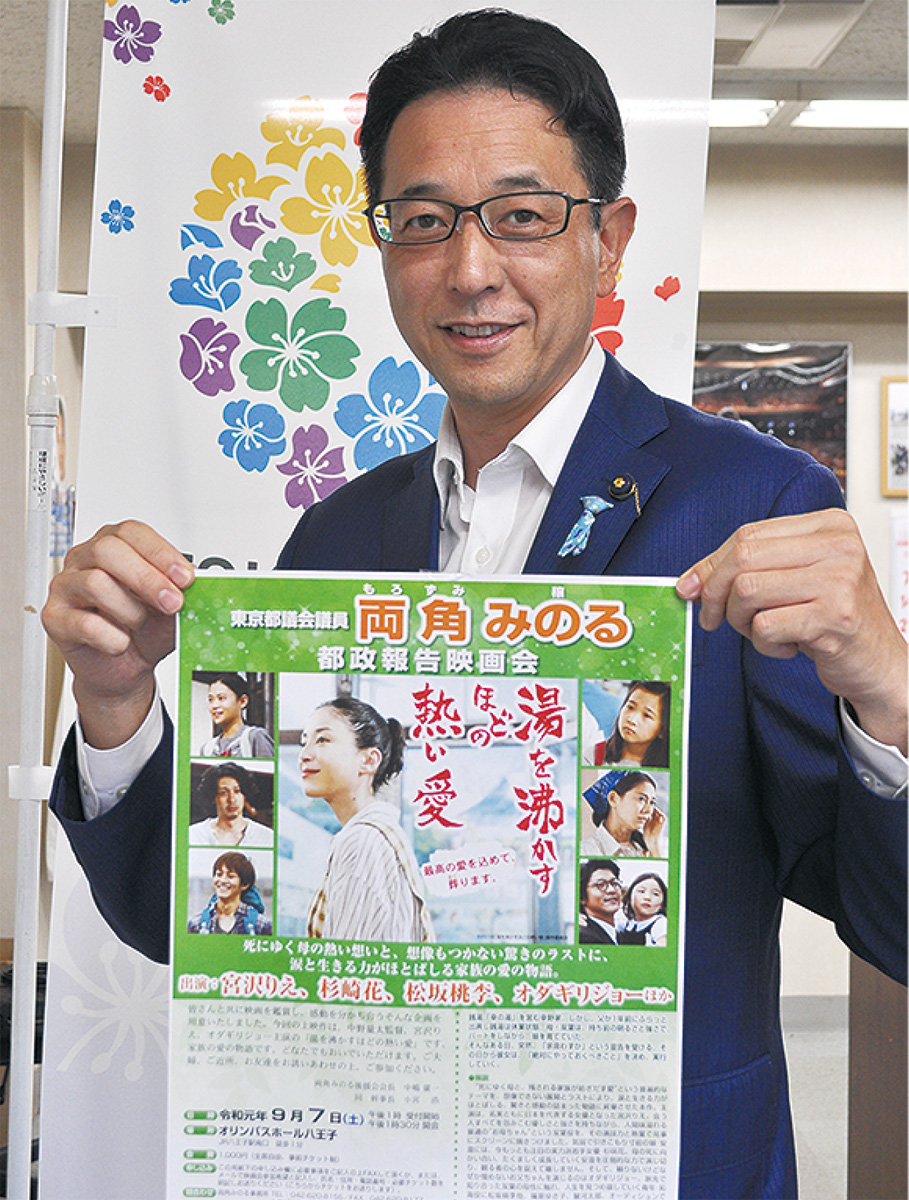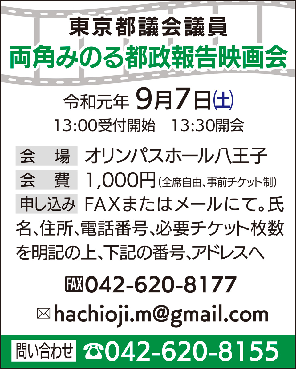 東京都議会議員の両角みのる氏は9月7日(土)、JR八王子駅南口のオリンパスホール八王子で都政報告映画会を開催する=表参照。