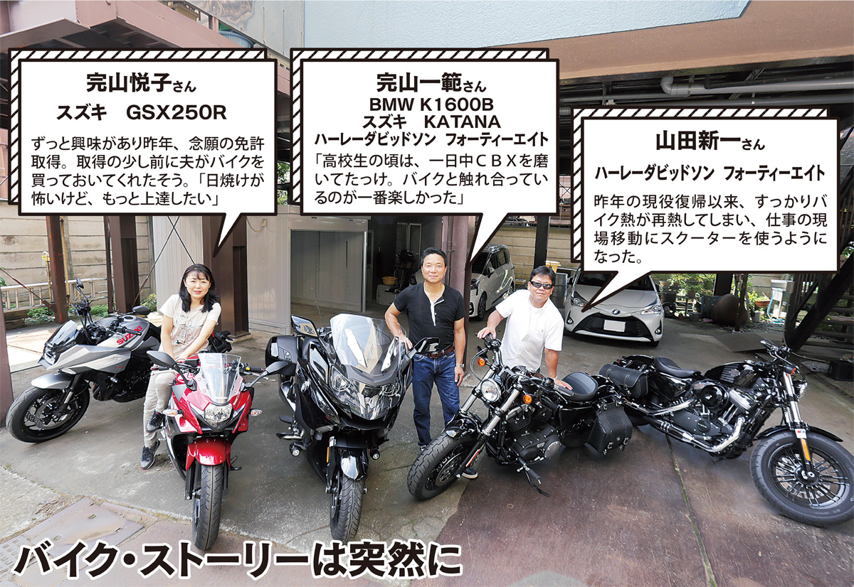 完山一範さんは、父親がバイクに乗っており、親戚もバイク店を営むなど、周囲の大人たちみんなが親しんでいたので、16歳で免許を取ったのも自然な流れだった。「1人でどこにでも行ける。『大人になった』って実感があった」。仕事の都合で乗れない時期もあったものの、今では存分に楽しんでいる。「バイクと一体になって走るのが爽快感。やっぱり『面白い』ってことに尽きるのかな」