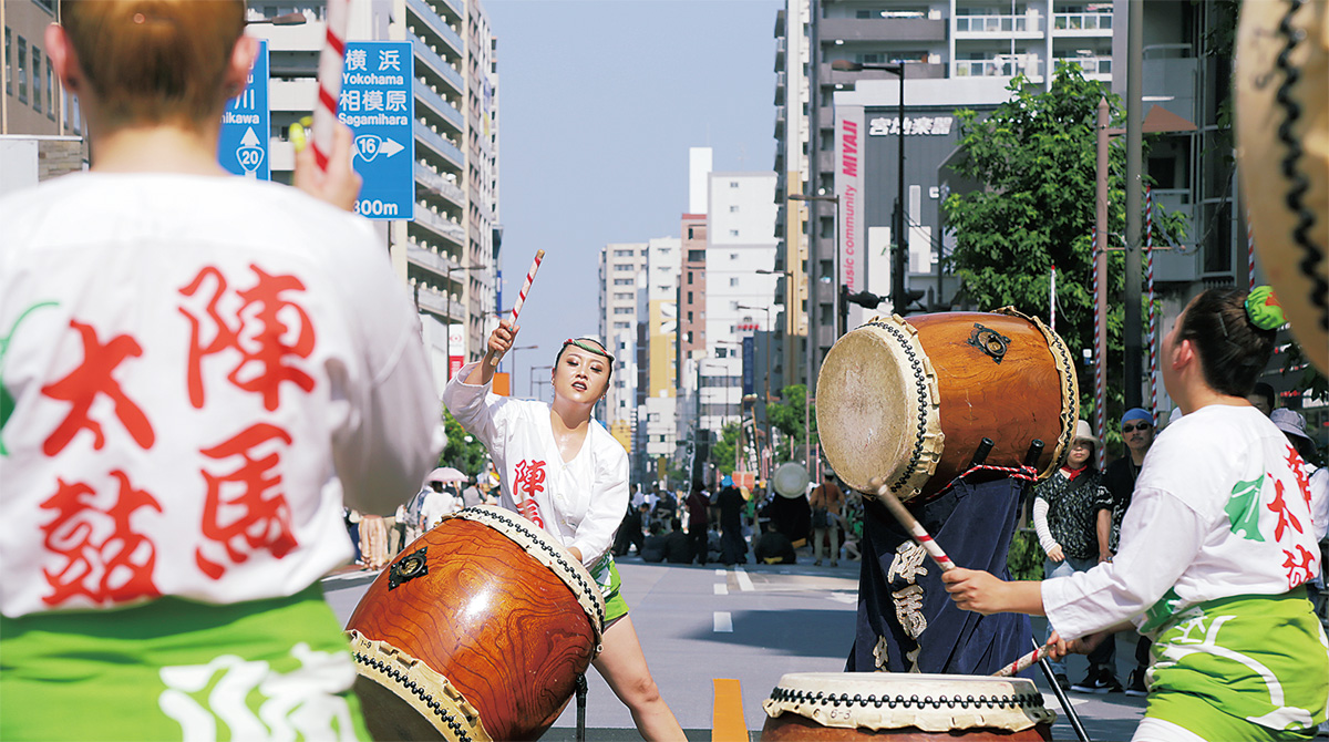 40年以上続くチームだけに全員10年以上のキャリア。会長の孫娘も10年前、中1で入ったそう。演奏者として最古参で副会長の酒井香代子さんは夫と長男、長女(幼稚園から叩いている)の一家4人で参加。「みんな昔から知っている仲だし、チームワークがいい。それが取り柄」と酒井さん。3日、例年決まっている「日陰になりにくく、ひと際日差しが厳しい」場所で熱い演奏を披露した。