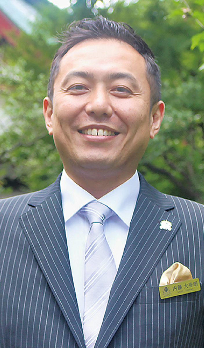 もう一か所が、40年以上に渡って八王子の「お祝い事」を彩ってきた鑓水の結婚式場、八王子日本閣。「撮影のみ」「食事だけ」の場所ではなく、記念撮影と個室での食事、双方を一緒に楽しめるスポットとして、「移動の負担が無いのは助かる」と子どもづれ家庭から高い支持を集めているのだ。「希望されれば、当館内滝の流れる日本庭園=写真=で記念撮影することもできますし、出雲大社の分社もあるので、そこでご祈祷を受けることも可能です」と担当する内藤大寿朗支配人=下写真=は笑顔を見せる。
