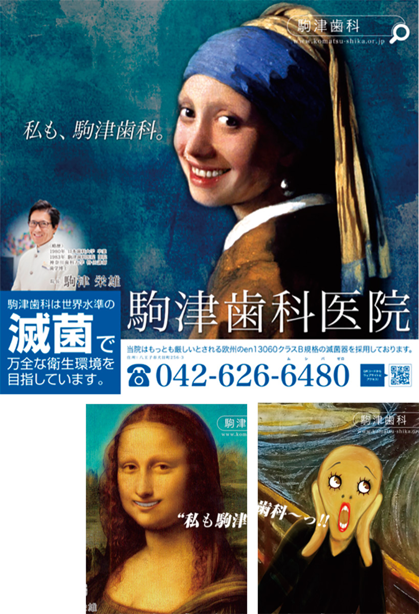 名画をモチーフにした看板で市民の目を楽しませているのは駒津歯科医院(犬目町)の作品。7月から八王子中野郵便局に掲出された新作はフェルメールの作品で通称「真珠の耳飾りの少女」をモチーフにした=上画像。原画とは異なり、看板では口が大きく開かれている。「もしこの名画の口が開いていたらどんなだろう?」という興味をそのまま表現した。