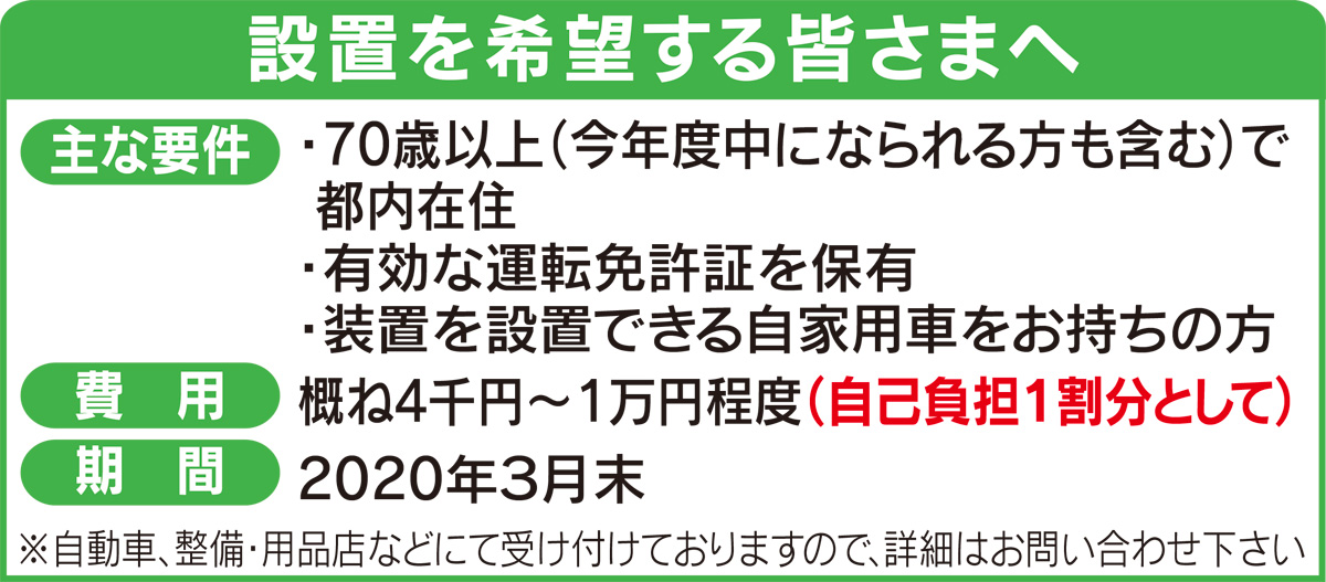 そこで東京都議会で4割の議席を持つ最大会派として私たち都民ファーストの会東京都議団は小池百合子都知事に緊急対策の要望書を提出。「高齢ドライバーによる事故の防止策」「免許を返納した高齢者の”移動の足”を確保する」取り組みを早期に制度化することを要求しました。今回実現したのが、高齢ドライバーの皆さまが自己負担1割(数千円〜1万円程度)で急発進防止の安全装置を自家用車に取り付けられる制度です。