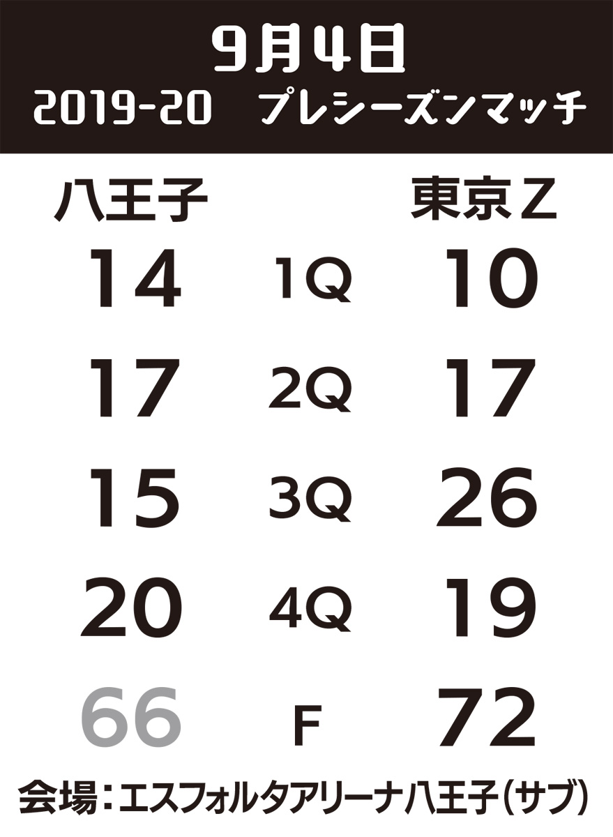 プロバスケB3東京八王子ビートレインズは4日、狭間町のエスフォルタアリーナ八王子にB2アースフレンズ東京Zをむかえ、2019―20シーズンのプレシーズンマッチを開催した。試合は66―72でビートレインズが敗れた。