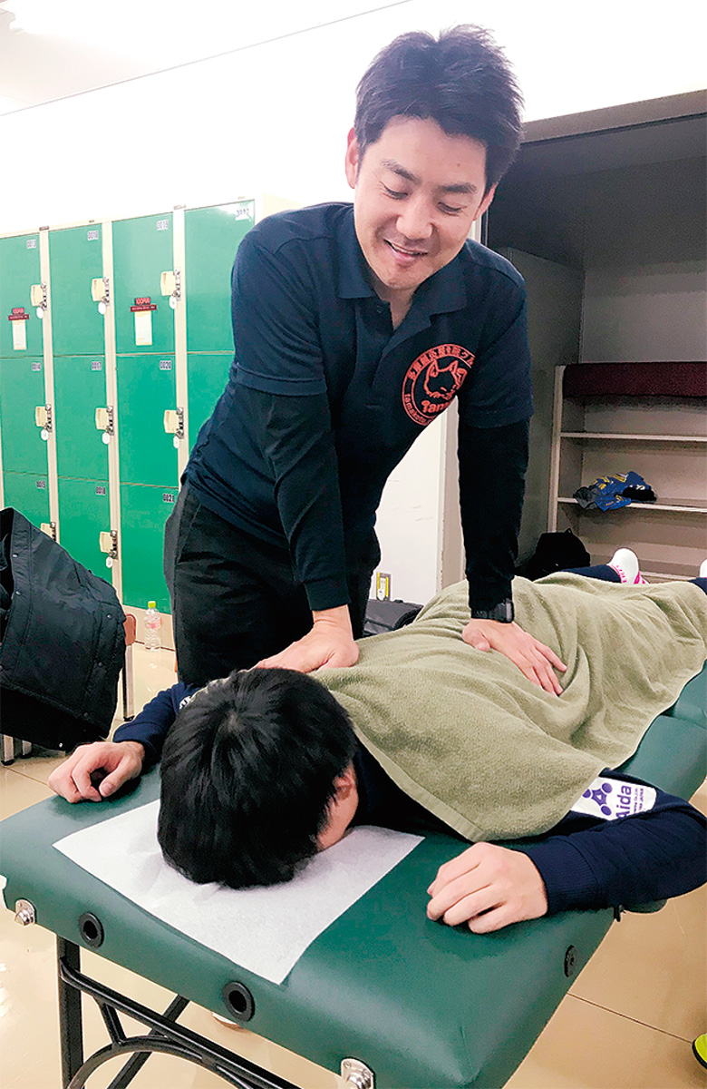 その中で昨季準優勝した岡山リベッツの選手の体をサポートしているのが、多摩鍼灸整骨院高倉本院(高倉町/【電話】042・645・5096)の矢崎伸治さんだ。昨季から関東圏で試合がある場合(立川や春日部など)に出張して施術している。