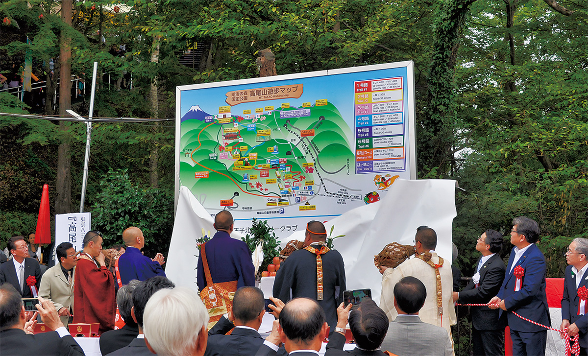 東京八王子北ロータリークラブ(鈴木豪会長)は創立25周年記念とし「高尾山遊歩マップ」を(公社)八王子観光コンベンション協会、高尾登山電鉄(株)に寄贈した。14日、マップの除幕式が開かれ関係者およそ60人が集まった。