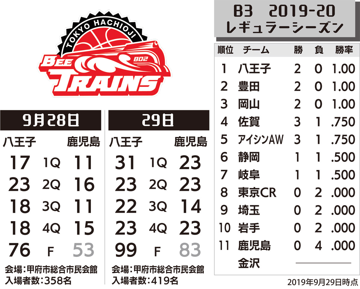 プロバスケB3東京八王子ビートレインズは2019─20レギュラーシーズンの開幕節を2連勝した。