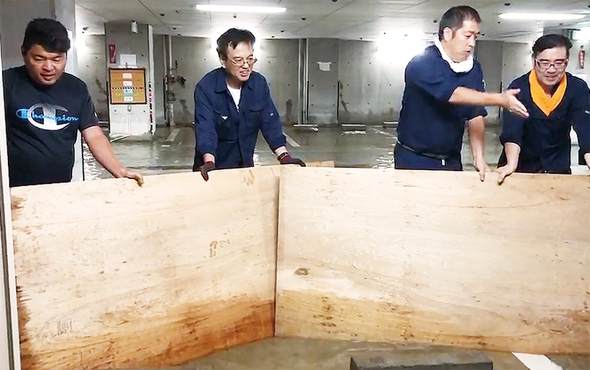明神町を拠点に不動産事業などに取り組む株式会社エイトは管理している市内施設の地下駐車場が水没。台風翌日に水出し作業にあたった。「ご迷惑をおかけしないように早急に対応した」と同社社員は話し、社員総出で復旧作業に取り組んでいた。