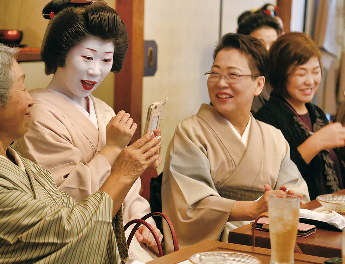 芸者3人はすぐに参加者とふれあい、一緒に写真を撮ったり、着物や髪飾りの話題に花を咲かせたりした。扇を投げるお座敷遊びもあり、躍りも披露した。参加者は「(芸者さんは)とても綺麗でびっくり。普段はテレビでしか見られないので新鮮」と話した。
