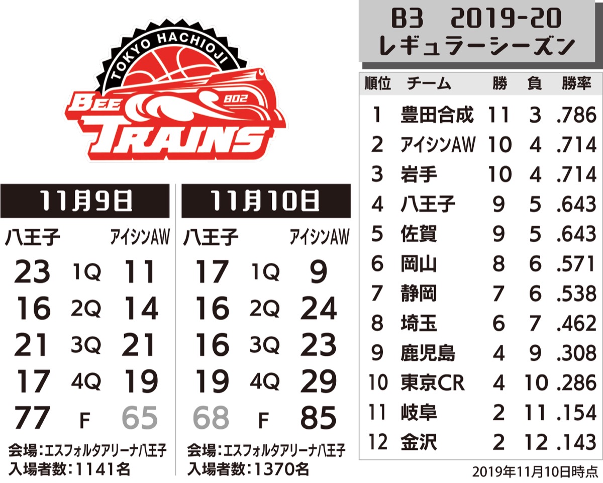 プロバスケB3「東京八王子 ビートレインズ」は11月9日、10日、狭間町のエスフォルタアリーナ八王子でアイシンAWと戦い1勝1敗だった。