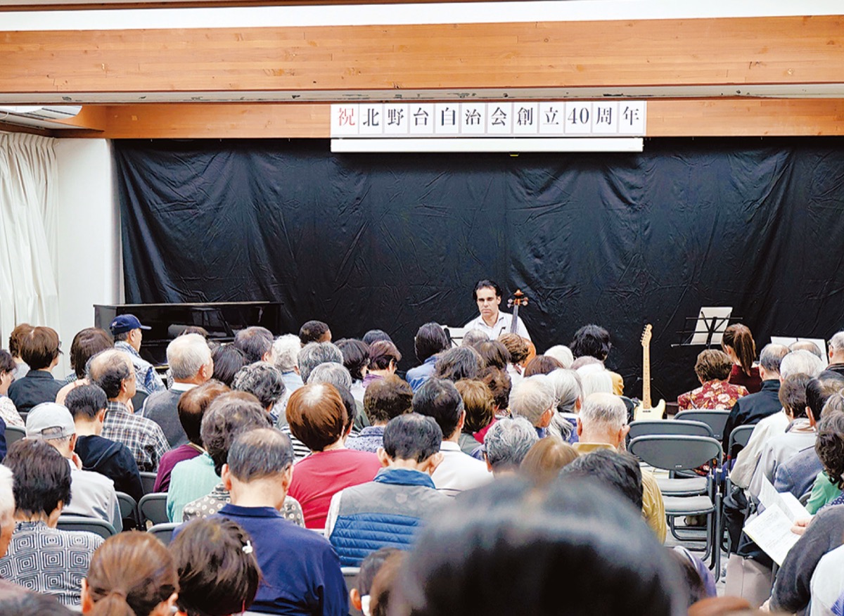北野台自治会(1〜4丁目)の「自治会創立40周年記念行事」が11月4日、同会館で行われた=写真。同地に音楽家が多いということから、音楽祭で節目を祝った。篠原由紀子会長は「若い世代も増えているので、元気よく」と話した。