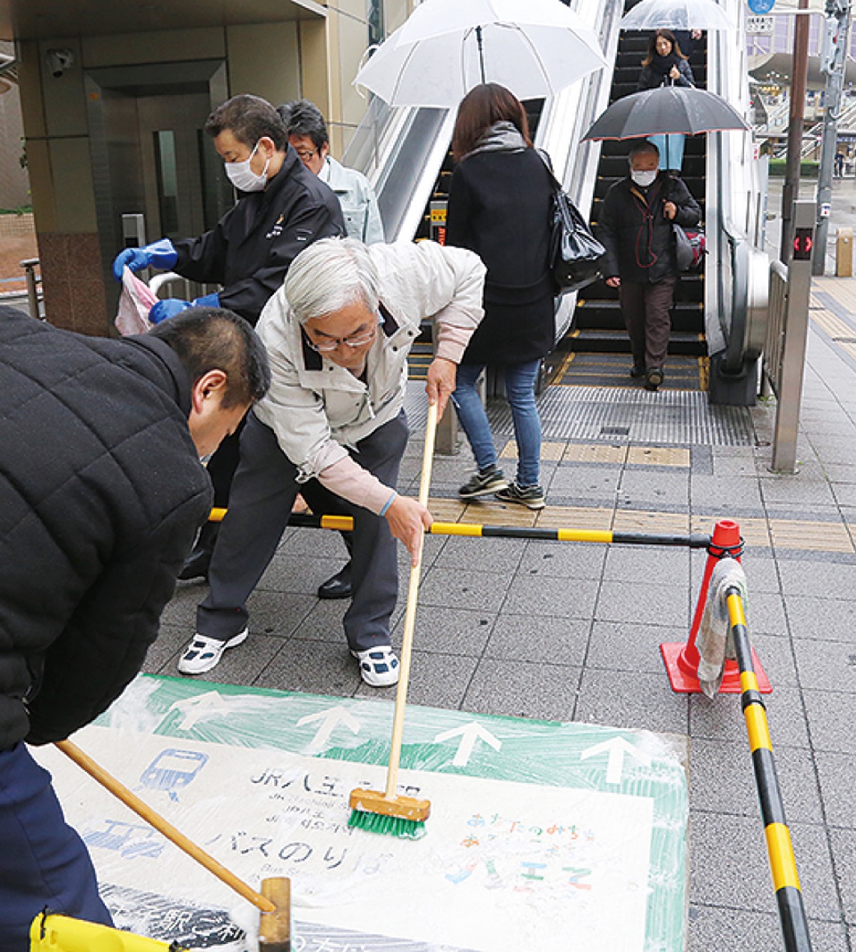 囲いを作って、ブラシで版をこすり、最後は通行人の転倒防止にと雑巾で拭き上げ。通行の妨げにならないように1カ所あたり約3分で仕上げた。この日は気温が低く小雨が降り、寒空の下での作業となった。